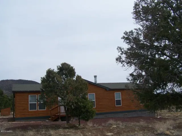 UNIQUE IN SO MANY WAYS-this log sided 4 bedroom manufactured home sits on your own 1 acre parcel across from 26 acres of heavily treed vacant land and 5 minutes from State Land.Unique because of the location,the panoramic mountain views and the open floor plan. You are greeted with a comfortable sized living room complete with fire place and picturesque views of mountains to the south that enables one to enjoy beautiful northern Arizona sunsets. The open flowing floor plan lends itself to warmth,communication,and family enjoyment.The home offers a split floor plan with a garden tub,dual sinks and walkin closet in the Master bedroom. The additional 3 bedrooms also have views of the surrounding mountains, walkin closets and a convenient full bath. Outside is a large open deck for enjoying