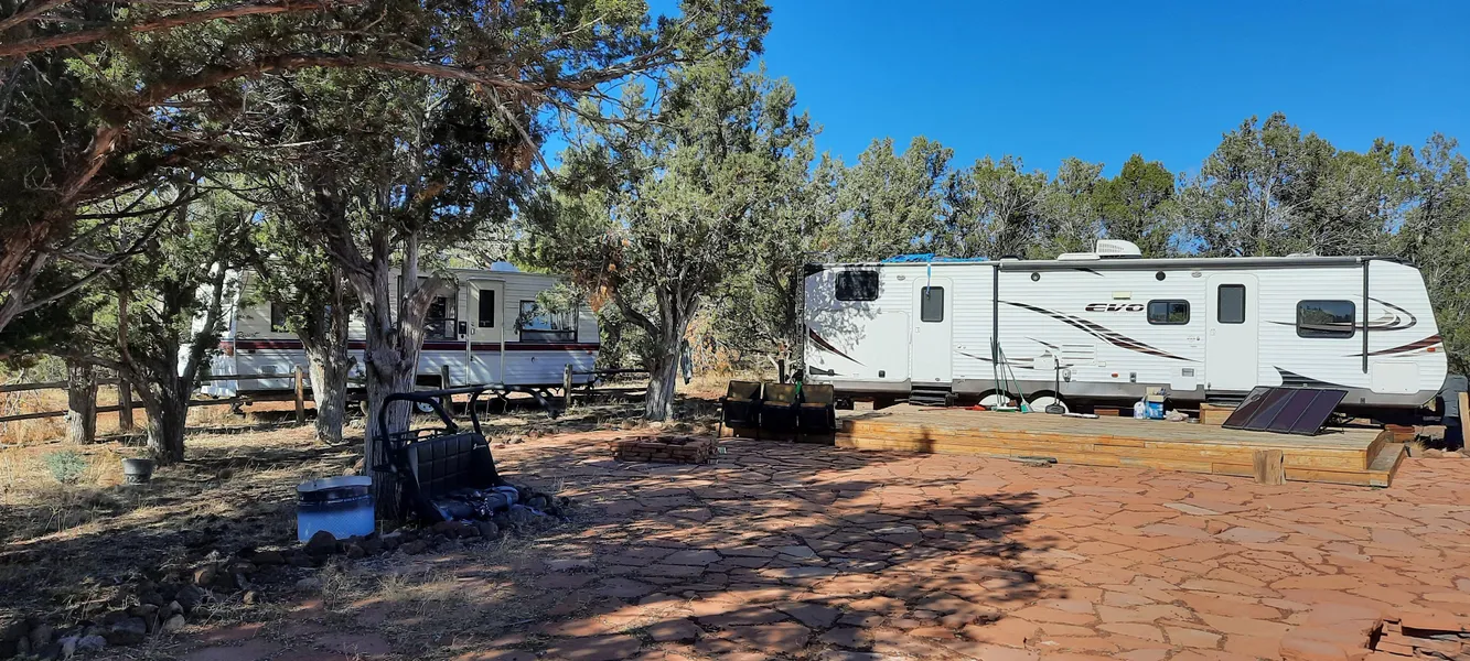 This 40 acres is a ready to go campsite. Beautiful views of San Francisco peaks and Mt. Floyd. 32 ft Forest River camper with 2 slideouts and outdoor cookout kitchen. 2nd Fleetwood camper for the kids to experience the out doors. Includes 1500 gallon water tank, generator, 24 ft storage container, and entrance gate. Explore or hunt zone 10 on 140,000 acre ranch with your family or friends.