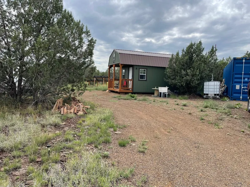 Own a piece of Arizona with Gorgeous mountain views, and PAVED access. This 2.12 acre lot has plenty of mature Juniper Trees. Wrap-around gravel driveway to get you safely to the county maintained road (which is plowed in the winter). The area has already been surveyed and the corners marked. The tiny cabin is fully insulated with finished walls/ceilings. Enjoy sleeping on a queen mattress in one of the two lofts or rock yourself asleep in a hammock on the ground floor. Enjoy the swivel wall-mounted large TV (new). Grab some food from the freezer (new). Both run off the solar system. Drink a cup of coffee/tea on the front porch and watch the sun rise over the mountains. Walk the lot and enjoy the flowers and wildlife - lizards, rabbits, squirrels, and deer. The cabin backs up to a Brand-new 40' Conex. This can be used for storage or converted to living or work space. Have the option of l...