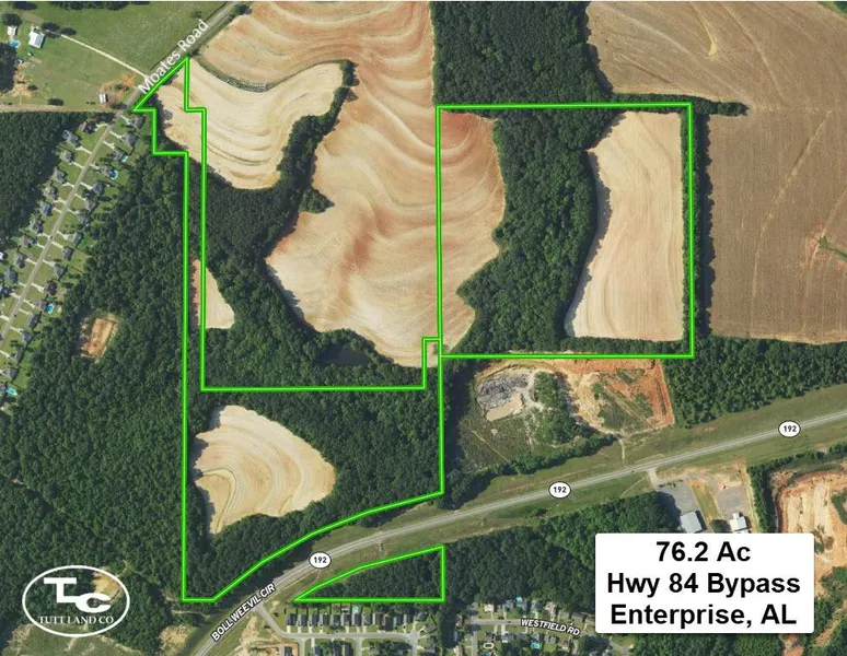 Outstanding investment opportunity in an area that is primed for growth! Here are seventy-six (+/-) acres of prime commercial or residential real estate with approximately 1,338 feet of road frontage on the Boll Weevil Circle. Located on the NW corner of the Boll Weevil Circle between the new High School and Hwy 134. The property extends north to include 365 feet of frontage on Moates Road, providing a second point of entry. 3.45 acres are on the other side of the highway providing an additional 886 feet of frontage on the Bypass. Approximately 25 acres are currently in cultivation. The balance of the acreage features a beautiful mix of mature hardwoods and pines with significant merchantable timber value and three small, seasonal creeks. Located inside the Enterprise city limits, and currently zoned Agricultural-2, this is an excellent location for either commercial or residential use. Recently surveyed at 76.2 acres. Average daily traffic count of 7,363 (2022, ALDOT).