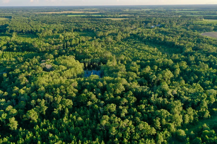 Approximately 115 acres are in planted pines, offering future timber income and excellent wildlife cover. The remaining acreage is a diverse combination of natural hardwoods, open fields, and multiple ponds—including a scenic cypress pond that enhances waterfowl habitat and adds aesthetic charm. Wiggins Creek forms the western boundary, serving as both a natural property line and a prime travel corridor for deer and turkey.
