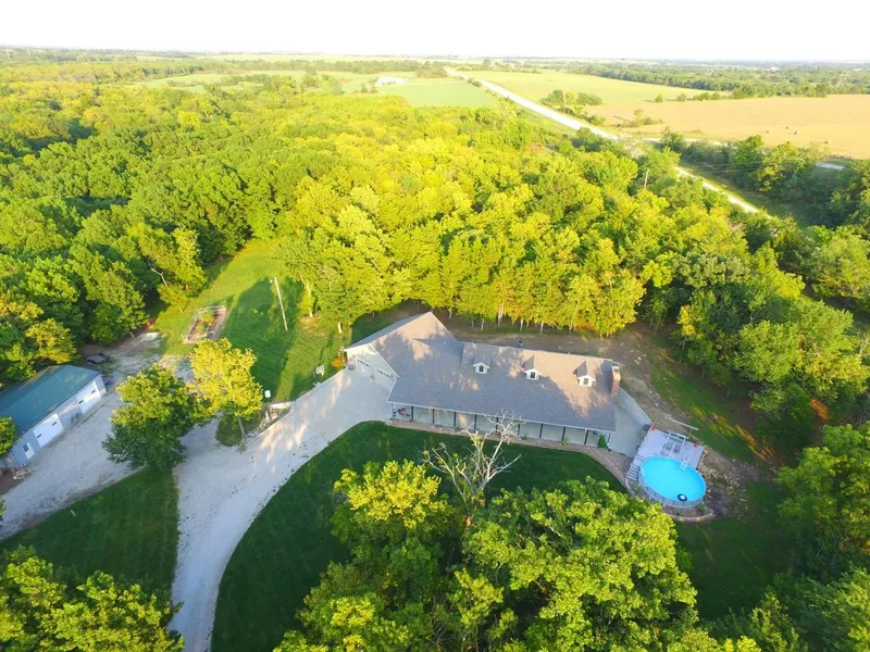 This listing represents one of the most attractive homes and rural settings in all of Coffey County. Situated on the banks of Wolf Creek amongst majestic hardwoods, you'll be hard pressed to find a more beautiful location for a rural home. It's only three miles to Burlington with pavement the entire route that allows for easy access to urban amenities. This highly efficient earth contact home was designed in excellent taste with a long list of features that you'll find listed below. The size of the home and convenient breezeway is approximately 3,200 total square feet with an oversized attached garage that's another 1,458 square feet. On the front of the home is an attractive shaded patio that totals 1,080 square feet. Just north of the home at the edge of the timber is a 30'X50' red iron, all welded, completely insulated metal shop. On the south end of the home is an inviting swimming pool surrounded by an approx. 22 'X 16' deck.