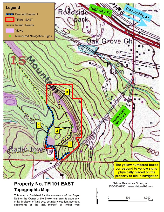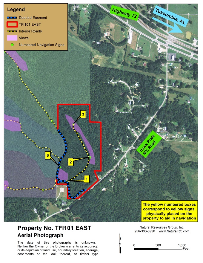 Research Parcel InformationFrom the intersection of Highways 72, 43 and 20 in Tuscumbia, AL, drive west on Highway 72 for 7.25 miles. Cross the median and travel east on HWY 72 a tenth of a mile to the entrance to the easement on the right. Look for Natural Resources Group signs at this point. From this point, use our locator maps to guide you as you travel through these beautiful properties.