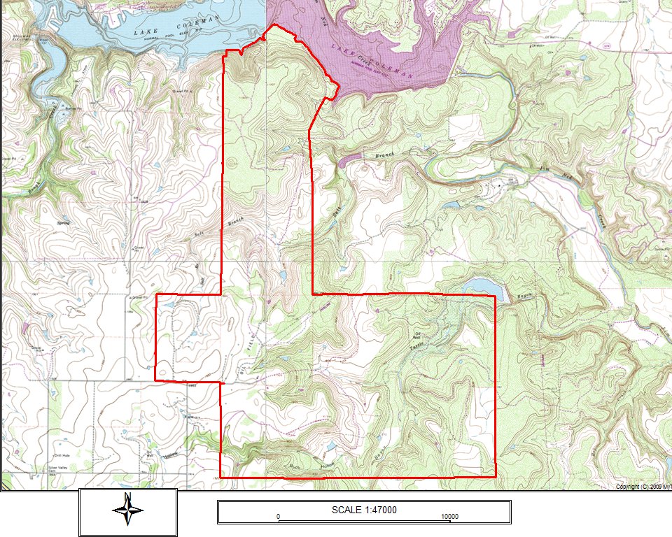 Description: The Walking Three Ranch was once a part of the Joseph Phillip Morris Ranch land that was established in 1883 in Coleman County. This original Morris Ranch was 100,000+ acres in size and was divided among J.P. Morris six children in 1922. The Walking Three Ranch is unique because it lies along the southern shore of Lake Coleman and has 2 +- miles of deep water frontage. This scattered oak shoreline also features a mildly sloping elevation change of 150 feet. A top the oak-lined ridge are numerous, beautiful building sites overlooking the lake, with views for miles. Lake Coleman was impounded in 1966 with maximum water depth of 48 feet and has a surface area of approximately 2000 acres. The Texas Parks and Wildlife rate Lake Coleman for Largemouth Bass, Hybrid Striped Bass, and Flathead Catfish as good to excellent and Florida Bass were introduced in 1985. The Walking Three Ranch is ideal for the hunter or cattleman and is fenced and cross fenced into 6-7 pastures. It has 350 +- acres of cultivation scattered throughout, with fields ranging in size from 35 to 100 +- acres making it ideal for food plots for wildlife or winter wheat for cattle. Elevation changes from 250 +- feet can be found across the ranch.