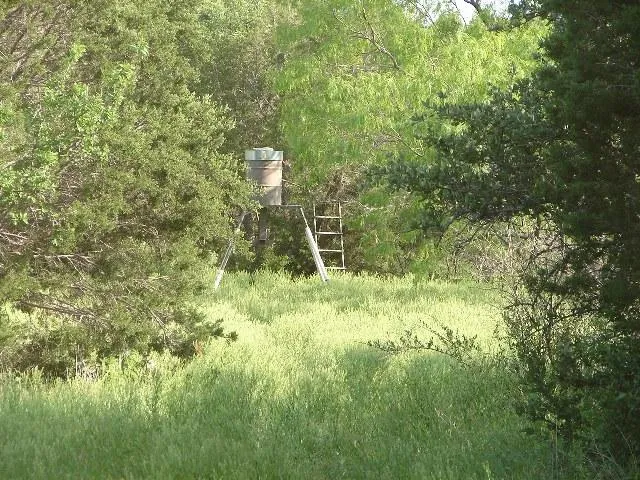 The terrain of the ranch is rolling with some excellent draws including a winding creek draw that runs throughout the ranch and holds pools of water most of the year and feeds one of the three tanks on the ranch. One of the tanks is stocked with bass. Cover is awesome on this ranch....lots of large live oaks, elms, hackberry, cedar, and mesquite as well as native brush providing great browse for the wildlife. You will find plenty of deer, turkey, dove, and hogs to hunt or just enjoy watching. Strategically located over the ranch you have two double blinds and feeders with small food plots around or near the feeders. Deer cam pics show deer, turkey, and hogs are regularly enjoying the corn and tender grasses in the food plots. A food plot of about 40 acres at the back of the ranch brings in the dove to round out the hunting package with some of the best dove hunting you will find anywhere in the state of Texas. A great interior road system is in place making all parts of the ranch easily accessible and perfect for riding 4 wheelers. The roads or trails meander off the main road and wind through the cover offering adventure at every turn and making it great to turn the kids loose to have fun exploring the ranch. Access to the ranch is via a paved farm-to-market road and the fences are good to new. A path has also been cleared around the perimeter so you can easily drive your fencelines in a four-wheeler or off road vehicle.