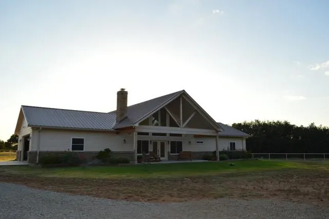A beautiful, newly constructed 3/2.5 home with almost 2200 sq ft of living area sits on the highest point of the ranch overlooking the lake. The home has a spacious living/dining/kitchen area with vaulted and beamed ceilings, a rock fireplace, granite countertops, sit down bar, and tile flooring except in bedrooms where there is carpet. Across the front of the den area are large windows allowing for a magnificent view from inside the home. A covered front porch offers the ideal place to relax in the mornings and late afternoons and enjoy the ourdoors. A large two car garage gives room to get the vehicles in our of the elements with plenty of room for storage. Landscaping is beautiful with established grass and flower beds. Around the home area is fenced to keep livestock from coming around the home.