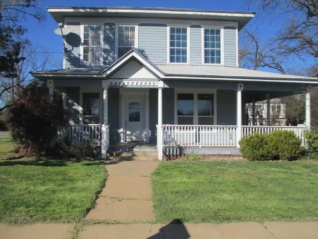 This home sits on a corner lot with a neat wrap around porch. Pecan trees everywhere plus a garage Apt. Hardwood floors and lots of possibilities. Needs a little TLC but owners will allow for kitchen floor. Beautiful kitchen cabinets and bar all bedrooms upstairs. Downstairs has a game room which could be a bedroom. Large bath upstairs with a 6 tub and bath downstairs has a shower. Apartment over garage has one bedroom and one bath.