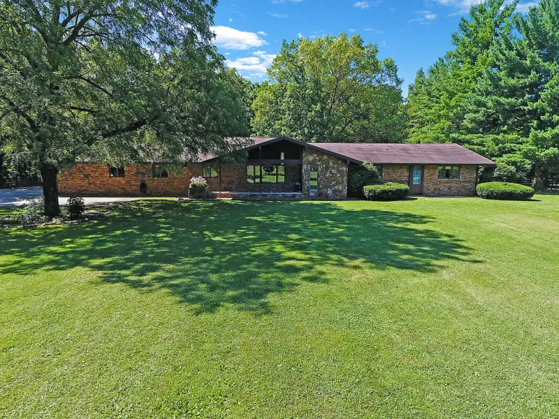 This Mid Century Modern Styled Ranch combines sleek sophistication with panoramic nature views. Nestled on 2.62 beautiful acres in town makes this property a rare offering. The function and design of this home are perfect for gracious living and entertaining. The main level features two oversized living areas, wood burning stone fireplace, wet bar, generous sized updated kitchen and two dining areas that overlook the wooded backyard. Also found on the main floor is a spacious master suite offering a walk-in closet and spa inspired bathroom and two generous sized bedrooms. There are endless opportunities for the lower level walk-out basement. A large rec room, second kitchen, bedroom, plenty of storage areas and much more await your personal touch. Other highlights include: designer lighting, well placed expansive windows that allow an abundance of natural light, 6 well geothermal heating and cooling system with humidifier and dual zone control. The outdoor living space includes a large deck with built-in seating to watch the seasons change. With over 5,000 sq. ft. this home is an amazing value at just $56 a sq. ft. Ask for a complete list of improvements and call today for a private tour!