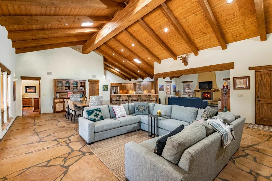 They don???t make them like this anymore! Gorgeous Angel Fire home sits up in the aspens and pines within the sought-after Vail Loop neighborhood. A perfect blend of Mountain meets Southwest, the interior details are unmatched! Large flagstones blanket the floors, along with stone window sills throughout, custom wood doors, and exposed window and door bucks. Enter the home through a long wood portico, into the large great room with vaulted tongue and groove ceilings. The light filled room offers the concept of open living; with the kitchen, a living room, family room, and dining area. The kitchen is well equipped with a large bar height island, and the cozy living room has a large Kiva style fireplace with built in niches for firewood and additional seating. The family room/great room area, is met with a wall of sun flooded windows, a view of woods and mountains, and has French doors lea...