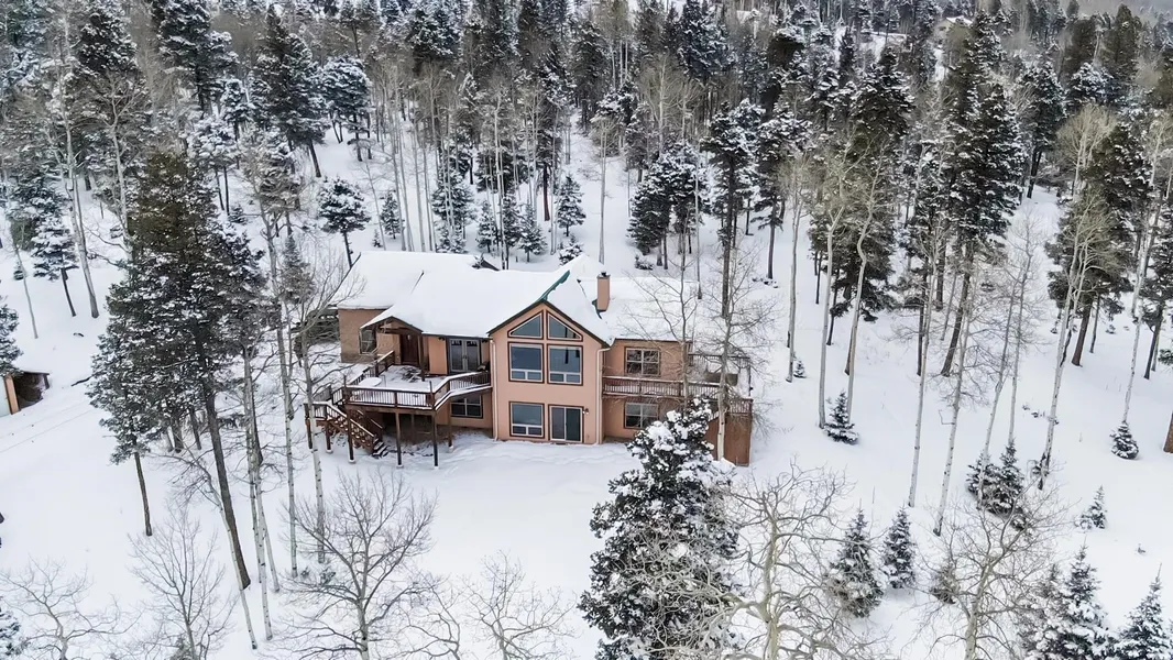 Spectacular Views from every room enhance the charm of this very well-maintained custom home that sits on 11 beautiful acres in the Aspens. This home has 4 bedrooms; 2.5 baths; a second living area/game room with wet bar; a home theater; workshop, a 2.5 car attached garage and a 2-car high profile detached garage for all your toys. The master bedroom/ensuite has a private deck with a hot tub, laundry and office. The downstairs is a second living area, three spacious bedrooms, a bathroom and workshop & lots of storage space. There are tile floors throughout with in-floor radiant heat. The property is beautifully landscaped with a fire pit and trees have been thinned for fire safety. House has high speed fiber internet through Kit Carson for you to work from home. Come up and see this true mountain retreat!