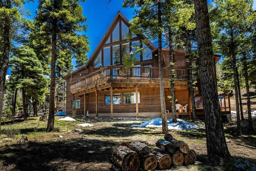 If you've been dreaming of a mountain retreat with stunning views, your dreams have come true. Perched halfway up the Angel Fire ski mountain, this home boasts panoramic views of Wheeler Peak, Angel Fire Resort's championship golf course, Eagle Nest Lake, and the famous "angel fire" sunsets. From the moment you step inside, it's clear this home was built to be warm and inviting. The open-concept kitchen with newer appliances flows easily into spacious living and dining areas - perfect for family meals or cozy nights in. With two large primary suites on the main floor, everyone from grandparents to guests can enjoy easy single-level living - no stairs required. You will find two more bedrooms, a bunk area for kids, and plenty of play space downstairs, plus a cozy TV room/office in the upstairs loft. There's plenty of room to sleep 11+ comfortably, making it ideal for big family holidays or entertaining friends. You'll love the generously sized walk-in closets, laundry room, and thoughtful layout to give everyone their own space. Whether it's quiet mornings with coffee or lively evenings with a full house, this home balances privacy and togetherness with ease. And the location? The home offers easy access by foot to hiking trails and is minutes from all the activities that Angel Fire Resort has to offer. Begin making your memories today.