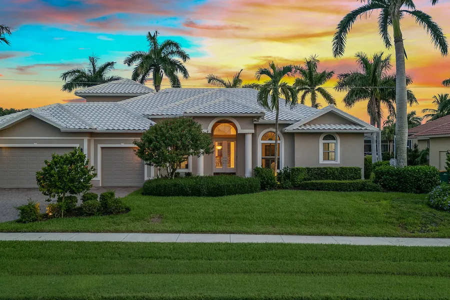 Experience luxury waterfront living in this turnkey furnished home with 100 feet of serene canal frontage. It is a boater's paradise with a private boat dock, dual jet ski lift and quick gulf access! Spanning 2,795 square feet, this beautifully renovated two-story residence, updated in 2023, includes four bedrooms, a den, three full baths and a three-car garage. Sunlight floods the home throughout the day, with the pool basking in sunlight year-round thanks to its southern exposure. Upon entering, you're greeted by new flooring, soaring volume ceilings and designer lighting. The open living spaces are ideal for entertaining, with tile flooring in the main areas and hardwood in the bedrooms, all complemented by white plantation shutters. The modern kitchen is a chef's dream, featuring white upgraded cabinetry, quartz countertops, a mosaic tile backsplash and newer top-of-the-line GE Café stainless steel appliances, all with extended warranties, including a Bosch refrigerator, dual conventional/microwave oven, and built-in cool touch cooktop. Adjacent is a full wet bar with custom shelving, a wine cooler and an under-counter ice maker, ideal for hosting. The spacious owner's suite features tray ceilings, crown molding and a luxurious en-suite bath with dual quartz vanities, Halo LED mirrors, a walk-in shower with floor-to-ceiling tile and a free-standing tub. The suite also includes a large walk-in closet with a custom California Closet system. One guest bedroom offers lanai access and an en-suite bath that doubles as a pool bath, while two upstairs guest rooms share a full bath. The den/study, with a double door entry and an arched window, provides a quiet space for work or relaxation. The expansive screened lanai, featuring a new screen enclosure, offers covered and uncovered areas, ideal for outdoor living. The heated pool, featuring a chiller, has been newly resurfaced with updated tile work and refreshed decking and is complemented by a separate saltwater spa. The outdoor area also includes a top-notch built-in TEC infrared grill, outdoor shower and ample seating to enjoy tranquil water views. This home is equipped with impact-resistant windows and doors, and electric storm shutters, updated electrical and PEX plumbing systems, a whole-home dehumidification system, a whole-home carbon water filter, a Sonos audio system throughout, a Generac generator, remotely tested/maintained weekly, a buried 500-gallon propane tank and newer 2018 tile roof. Additional features include new lift motors and controllers for the boat and jet ski lifts, plus a negotiable Jeep Wrangler. Kayaks, jet skis, eight bicycles, two paddle boards, and all tools and fishing equipment are included. Ideally in the southwest quadrant of Marco Island, this home is a short distance to the beach entrance and vibrant shops, theater and restaurants of Marco Walk Square, with easy access to additional gourmet dining, shopping and golf courses by bicycle or car.