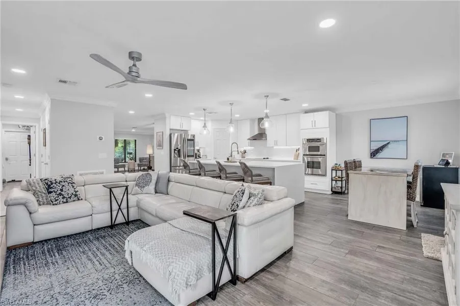 PRICE IMPROVEMENT! Welcome to 14971 Savannah Drive! Situated on over .25 acres, this beautiful 5 bed, 3.5 bath nestled in Indigo Lakes has been updated throughout. Walk into the inviting foyer that leads you to a large dining and sitting area. Wood look tiled floors throughout the first floor enhance the coastal feel of the home. The spacious open floor plan leads to the fully updated kitchen and family room. Kitchen updates include shaker, soft touch cabinets, quartz countertops with a waterfall quartz island, top of the line stainless steel appliances, tiled backsplash and updated pendant lighting. The first floor primary bedroom has new luxury vinyl plank flooring and two walk in closets! The ensuite primary bathroom is a dream with large tiled shower with bench, dual vanities and updated flooring and dimmable lighting. The updated half bath and laundry room complete the first floor. ...