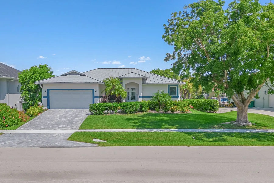 Whether you are looking for an investment property or a place to call home, this beautifully remodeled three-bedroom, two-bath single-family pool home offers low insurance rates and excellent rental potential. Along a tranquil canal with quick gulf access, this stunning residence was completely transformed in 2023, offering a serene water view, a private boat dock with a lift and a wealth of modern amenities. The exterior features a new storm-rated metal roof, impact windows and doors, and a refreshed driveway, walkway and stairs, all complemented by lush new landscaping. The expansive lanai, with its rescreened and freshly painted enclosure, boasts new tile flooring, a covered outdoor living space and an additional seating area by the water, ideal for entertaining or relaxing by the pool. The pool itself has been upgraded with a modern sports depth, a new heater and chiller with a Jandy remote system, built-in benches and a PebbleTec surface. Inside, this turnkey furnished home shines with new wood-like tile flooring, vaulted ceilings and abundant natural light. Every detail has been meticulously updated, including new paint inside and out, new lighting, ceiling fans and custom Hunter Douglas blinds throughout. The all-new kitchen is a chef's delight, featuring sleek white cabinets, quartz countertops, an island with seating and storage, and new LG stainless steel appliances. The family room seamlessly opens to the lanai through glass sliders, offering captivating water views. The formal dining area is enhanced by a new built-in buffet cabinet, ideal for hosting gatherings. The owner's suite provides lanai access and a luxurious en-suite bath with a dual vanity, walk-in shower and custom walk-in closet. The two guest bedrooms share a beautifully appointed full bath with a shower-tub combo tiled from floor to ceiling. The laundry area includes a Whirlpool top-load washer and front-load dryer, with additional shelving for storage. The two-car garage is equipped with a Proslat storage system and new epoxy flooring. With its high elevation, this home offers practicality and luxury, including transferable flood insurance. Ideally near Residency Beach and the Esplanade, it provides easy access to all of Marco Island's premier amenities, from pristine beaches to gourmet dining and shopping. This home is a rare gem, ideally positioned to enjoy the best of coastal Florida living.