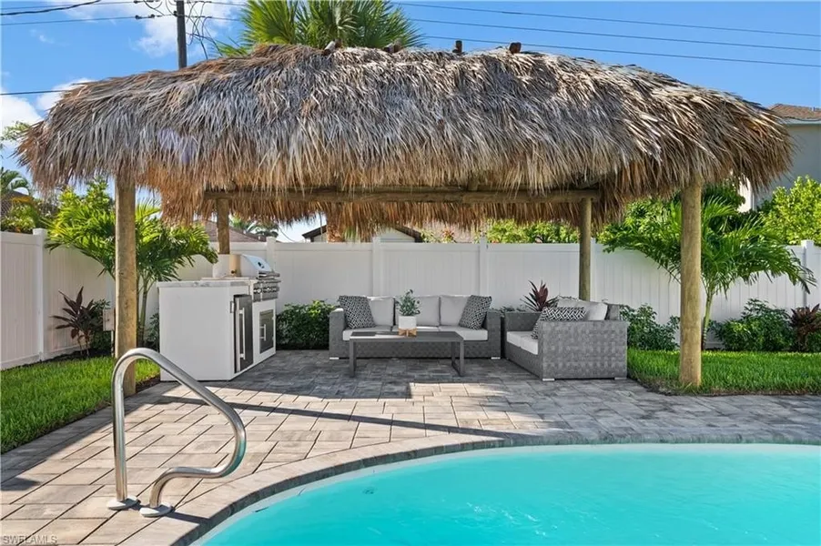 Discover your ideal Florida retreat in the highly sought-after Naples Park 500 Block! This beautifully remodeled 3-bedroom, 2-bathroom home seamlessly blends modern elegance with laid-back coastal living. Located just steps from Vanderbilt Beach and premier shopping, this residence offers the perfect mix of sophistication and accessibility. The open-concept layout features new tile flooring that flows effortlessly through the living spaces, adding both style and functionality. A gourmet kitchen takes center stage with a stunning waterfall island, shiplap accents, KitchenAid appliances, and innovative pop-up wireless charging stations. With expansive counter space and bar seating, it's the perfect place to cook and entertain. Spacious bedrooms boast custom closets, while the master suite overlooks the pool, creating a tranquil retreat. The guest bathroom offers a relaxing tub, ideal for unwinding. Completing the interior is a freshly painted look, modernized with a new roof, impact glass windows, and sliders for comfort and peace of mind. Outside, enjoy resort-style living with a saltwater pool surrounded by new pavers, complemented by an outdoor kitchen, a grill, and a charming chickee hut. The screened front porch is perfect for morning coffee or evening cocktails, while lush tropical landscaping, a manicured lawn, and new landscape lighting create a serene ambiance. With updates such as an epoxy-coated garage floor and a new irrigation system, this property is truly move-in ready. Whether you're looking for your dream home or a high-yield vacation rental, this Naples Park retreat offers unmatched quality and appeal.