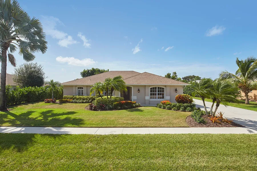 Beautifully renovated and meticulously maintained 3-bedroom, 2-bath home features vaulted ceilings in living areas, additional family room, plantation shutters, kitchen redesigned with all new cabinetry, hardware, quartz countertops, under-cabinet LED lighting and jewel-tone backsplash. New stainless steel appliances. All new crown molding with rope lighting throughout. All new casement, baseboards completely painted interior and exterior. All new door hardware, new fans and lights fixtures throughout the home. The master bath has quartz countertops, new cabinetry, frameless shower doors. The master bedroom has custom closets. All new carpet and tile throughout. All LED lights throughout the home, new smoke detectors, AC unit 2020. New front entry door and back door. Landscaped with new zoysia sod, new hedge, and all new bushes and trees. Spacious lanai which overlooks the private backya...