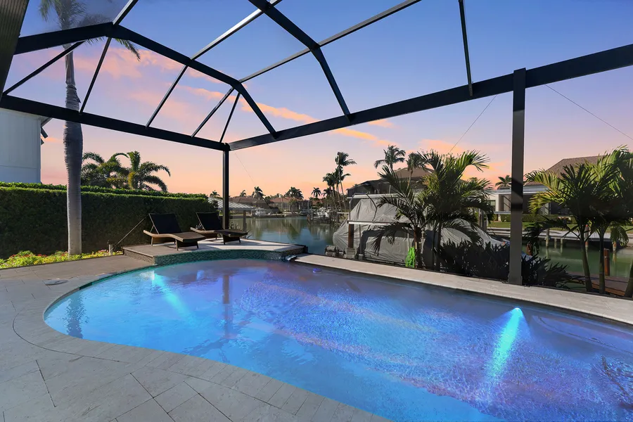Discover the epitome of island elegance in this immaculate, RK Reiman-built waterfront retreat, offering over 3,181 total square feet with 2,000-plus square feet under air. Ideally just minutes from open gulf waters, this home is a boater's paradise, boasting an extensive dock system with dual boat lifts, a walk-around side platform, and double jet ski lifts and dockage, ideal for effortless days on the water. Step inside to experience coastal sophistication at its finest. Professionally decorated, this residence features volume ceilings, elegant crown moldings, and a refined blend of wood and tile flooring throughout. The primary suite is a serene retreat, showcasing Brazilian hardwood flooring, a spa-like en suite and breathtaking water views. Designed for everyday luxury and entertaining, the home offers a spacious great room and separate family room, along with a formal dining room for intimate gatherings. The gourmet kitchen is a chef's dream, complemented by a separate service kitchen featuring a Sub-Zero refrigerator and Wolf oven. For the car enthusiast, the three-car garage is a standout feature, complete with epoxy flooring for a sleek, durable finish. Many upgrades in this beautiful home including new roof in 2018, garage makeover with epoxy floors, remodeled bedrooms, new butler's pantry, with Wolf appliances, new lanai screens, new boat lift and much much more! Whether you're setting sail from your private dock, hosting sunset gatherings or simply relaxing in this exquisite coastal haven, this home embodies the best of Marco Island waterfront living.