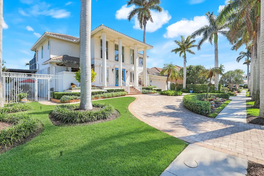 A serene oasis of luxury and comfort. In a prime south end location, this stunning three-bedroom-plus den, 3.5-bath, two-story home offers an unparalleled waterfront living experience. With gorgeous wide and long water intersecting canal views, this residence captures the essence of elegance and tranquility. Enter upon an open and spacious great room, where high ceilings and an abundance of natural light create a welcoming ambiance. The separate dining area provides an intimate setting for family meals and entertaining guests. An open gourmet kitchen is a chef's dream, featuring granite countertops, a breakfast bar and an island with additional counter seating. It boasts a built-in electric wall oven with a warming tray, a cooktop, and ample cabinet space to store all your culinary essentials. Off the kitchen is a gorgeous wine and coffee bar, making it the ideal place to make your morning coffee or evening cocktails. The den, equipped with built-ins, offers a versatile space for a home office or cozy reading nook. A first-floor guest main en suite ensures privacy and comfort for visitors, while the main primary suite and an additional bedroom with en suite on the second floor provide luxurious accommodations. Both upper-level suites feature access to a private balcony with breathtaking views. Beautifully sketched glass entrance doors add a touch of elegance. Experience outdoor living at its finest with an expansive screened lanai and an entertainer's paradise, complete with a pool, spa, pool bath, and separate open patio with a bar and summer kitchen. This outdoor haven is ideal for hosting gatherings or simply enjoying a serene dining experience al fresco. For the boating enthusiast, the property includes a dock with three lifts and a large composite deck, ideal for sunbathing and watching dolphins play. Whether fishing or exploring the open waters, this dock caters to all your aquatic adventures. A private Zen garden offers a peaceful retreat for relaxation and meditation. Impact glass, manual and electric shutters. New roof in 2017. Oversized two-car garage with circular driveway for extra parking. This home seamlessly blends luxury, comfort and functionality, making it the ideal sanctuary for those seeking an opulent lifestyle.