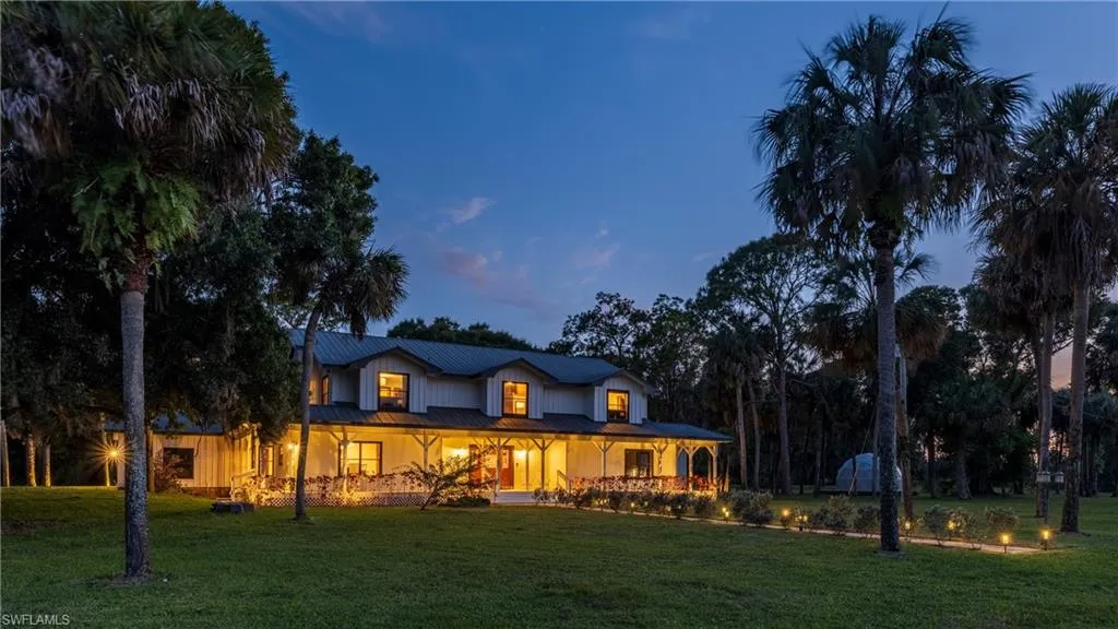 Welcome to Genesis Ranch - A Luxurious Private Estate on sprawling Acres of Natural Beauty. Nestled just 10 miles east of charming Ave Maria, Genesis Ranch is where timeless rustic elegance meets modern comfort. This renovated peaceful estate spans over 24 lush acres and offers a serene, self-sustaining lifestyle without sacrificing convenience-your nearest gas station and convince stores are just 1.7 miles away. Step inside the main residence, where rich wood-paneled walls and soaring ceilings exude warmth and sophistication. The heart of the home is the Grand Great room, anchored by a dramatic floor-to-ceiling stone fireplace-perfect for cozy evenings or entertaining on a grand scale. A spacious loft overlooks the space, adding a huge second living space. Chef's kitchen is a culinary dream, featuring dual ranges and two dishwashers, designed to handle both intimate meals and large gatherings and events with ease. Just beyond, the screened lanai invites you to relax and entertain in style, boasting a 14x40 pool and sun-soaked deck-the ultimate setting for sunset swims and starlit nights. Outdoors, Genesis Ranch transforms into a natural sanctuary. Stroll through meandering walkways shaded by majestic oaks or explore your very own Food Forest with over 100 fruit-bearing trees-an eco-lover's paradise that qualifies for a county Agro Exemption. A tranquil lake adds to the ambiance, offering picturesque views and a peaceful backdrop for everyday living. For those with larger dreams, a 2,400 sq. ft. three-bay steel building provides endless possibilities-from RV, boat, and vehicle storage to a future equestrian barn. Whether you're envisioning a private family compound, a luxurious homestead, or a one-of-a-kind event venue, Genesis Ranch is ready to exceed every expectation. Tractor included. Geodesic dome Yurt on deck offers great place to camp on your own property or makes a great she shed/mancave alternative. Endless potential. Unmatched privacy. Welcome home to Genesis Ranch.