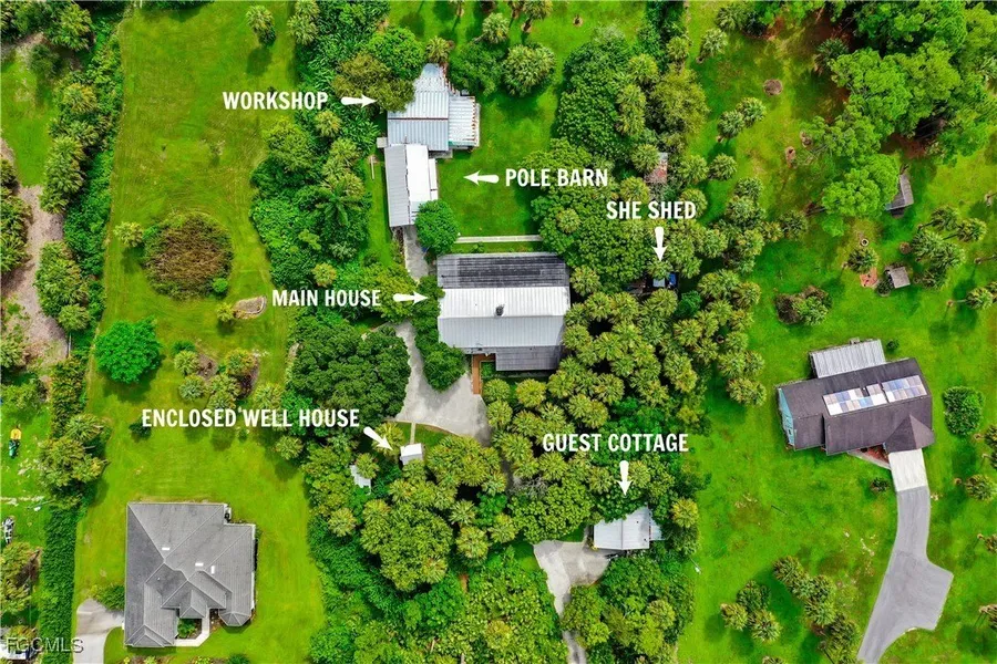 UNIQUE PROPERTY w/ guest cottage, workshop, & pole barn! Almost 3 acres in one of the most desired areas of Naples w/ main home, guest cottage, "she shed" w/ plumbing & electricity, large pole barn, & workshop. The long paved driveway winds through natural Old Florida landscaping which eventually reveals a cute-as-a-button guest cottage that is perfect for a "in-law suite" w/ 1bed/1bath, full kitchen, dining area, great room, enclosed lanai, laundry closet off of lanai, fenced yard, and wide 2-car parking area. Sitting further back on the property is the main home w/ huge parking area that will fit rv/boat & 4+cars, open front porch, great room design, split bedroom floor plan, master suite w/ 2 walk-in cedar walled closets, guest suite w/ full bath & walk-in closet, dining area, spacious kitchen, laundry room w/ shelving & utility sink, den, attached 1-car garage, and screened rear lana...