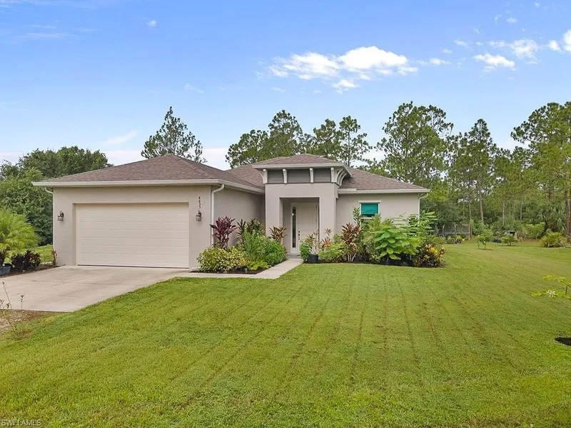 Built in 2023, this stunning 3-bedroom plus den home with a 2-car garage is tucked away on 2.27 acres (no wetlands) at the end of a quiet dead-end street in the desirable NE section of Golden Gate Estates in Naples, Florida, offering peace, privacy, and no traffic noise. Full of soothing color tones and warm wood accents, the home exudes a comfortable, cozy feeling while still offering modern elegance. Thoughtfully upgraded throughout, it features solid wood maple 41" cabinetry, quartz countertops, upgraded stainless steel Samsung appliances with drawer microwave and hood system, French doors to the den, frameless shower glass in the primary bathroom, an expanded primary closet, and smart design touches like a 40-amp outlet for EV charging, epoxy-coated garage floor, CAT5e wiring to every room, a whole-home surge protector, and a monthly serviced whole home reverse osmosis water system. Outdoor enhancements include gutters around the entire home, plumbing for a future outdoor kitchen, over 15 young fruit trees, a 320 sq ft storage container, and an expanded roundabout driveway. The property also carries a structural warranty through 2033. Ideally located just 15 minutes to Palmetto Ridge High School, Corkscrew Middle School, the new Publix shopping center with dining and retail, and Corkscrew Swamp Sanctuary where you can stroll through nature and wildlife, plus only 20 minutes to Seminole Casino, this home offers both modern comfort and the serenity of estate living.
