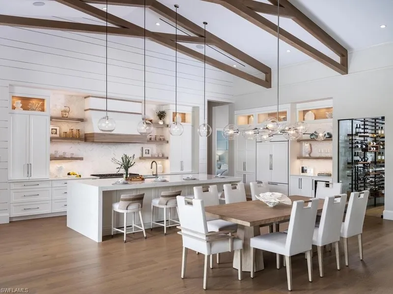 2024 Sand Dollar Winning Custom Home built by Platinum Custom Homes and furnished by Clive Daniel Homes, nestled on an idyllic 1 acre lot only minutes from the beach, this 4BR/5.5BA, 5,824 sqft executive residence emanates coastal elegance and immaculate tropical landscaping. Thoughtfully designed with both beauty and function, the sundrenched interior mesmerizes with soaring vaulted ceilings, an oversized great room with fireplace, and a gourmet kitchen featuring premium stainless-steel appliances, quartz countertops, gas range and a butlers pantry. Evoking luxe indoor/outdoor vibes, the entertainment-ready backyard includes a covered lanai, an outdoor kitchen, a fireplace, a swimming pool, and a spa. Blissful evenings are discovered in the primary suite which has huge dual closets and an opulent en suite with dual vanities, a soaking tub, a walkthrough shower. Three additional bedrooms have walkin closets and en suites. Other features include: 4-car garage, bonus room, exercise room, Collier County water, lighting control in main areas, Sonos speakers, generator, roll down screens & shutters, water softener, airconditioned garages, entry columns and gates are underway and so much more.