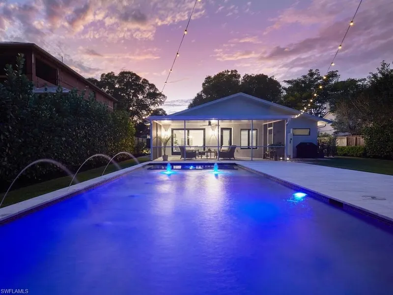 Reimagined in 2022, this designer Lake Park residence was renovated to the blockwalls with new plumbing, electrical, roof, impact windows and doors, ductwork, and refined interior finishes throughout. Soaring 9-foot ceilings and oversized Andersen windows fill the home with natural light, creating a bright, modern ambiance rarely found in classic Lake Park cottages. The chef's kitchen is finished with Cabico cabinetry, Cosentino Silestone counters with full-height matching backsplash, Cafe appliances, and designer lighting, all complemented by Delta Vero plumbing fixtures and Emtek hardware throughout. Custom built-ins, all-wood plantation shutters, and 6-inch baseboards reinforce the home's curated, high-quality feel. The flexible third bedroom or office is enclosed by a custom modular wall system and flows seamlessly from the great room. The private owner's suite and guest accommodations feature beautifully remodeled baths and thoughtful storage. Outdoors, a screened lanai opens to a newly constructed heated pool and oversized spa for eight, complete with twin LED bubblers and three deck jets. New landscape lighting, irrigation, and a 12-foot clusia hedge create a lush, private backdrop across the generous 8,276-square-foot lot. A gated side yard offers additional vehicle or golf cart parking. With no HOA, flexible leasing, and a prime location just minutes to the Gulf, 5th Avenue South, and 3rd Street South, this turnkey Lake Park retreat delivers the feel of new construction with the charm of an established neighborhood.