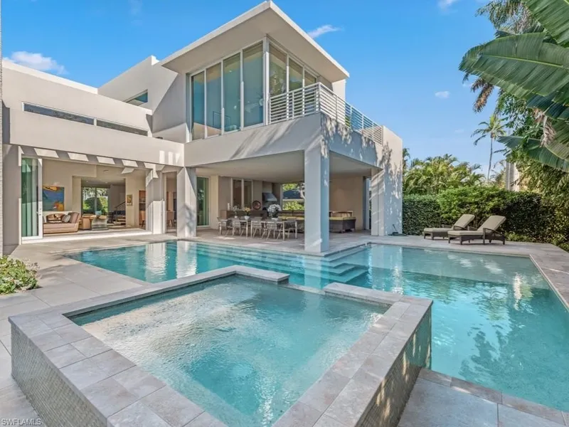 Tucked away on a quiet street in the heart of The Moorings, 440 Spinnaker Drive presents a refined blend of architectural intention, privacy, and timeless Naples living. Built in 2016, this custom residence sits on an oversized homesite with desirable southern exposure, delivering natural light throughout the day and an effortless connection between indoor and outdoor spaces. Clean modern lines, expansive glass, and thoughtfully curated finishes define the home's aesthetic. The interior feels open yet grounded-designed to accommodate both intimate living and large-scale entertaining without compromise. Subtle architectural elements, from floating stair details to statement lighting and layered textures, elevate the experience without overwhelming it. The kitchen and main living areas flow seamlessly toward the outdoors, where lush landscaping frames a resort-style pool and spa. Covered a...