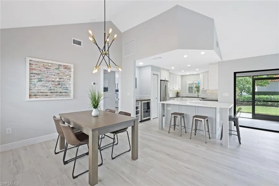 Available for November December and April! Nestled less than a mile from the pristine Vanderbilt Beach, this exquisitely renovated TURNKEY FURNISHED two-bedroom, two-bathroom villa with a two-car garage offers a luxurious retreat. Soaring high ceilings, an abundance of natural light, and elegant porcelain tile flooring create an inviting ambiance, complemented by a serene private courtyard and newly redesigned master and guest bathrooms. The stunning modern kitchen boasts brand-new stainless steel appliances, a spacious island with a bar area, and a wine refrigerator—perfect for entertaining or unwinding. The screened lanai flows effortlessly into an outdoor patio featuring a grill and lush backyard, ideal for evening relaxation. A short stroll or bike ride away, enjoy breathtaking nightly sunsets at Vanderbilt Beach! Beachwalk, a prestigious 24/7 gated community, enhances the experience...