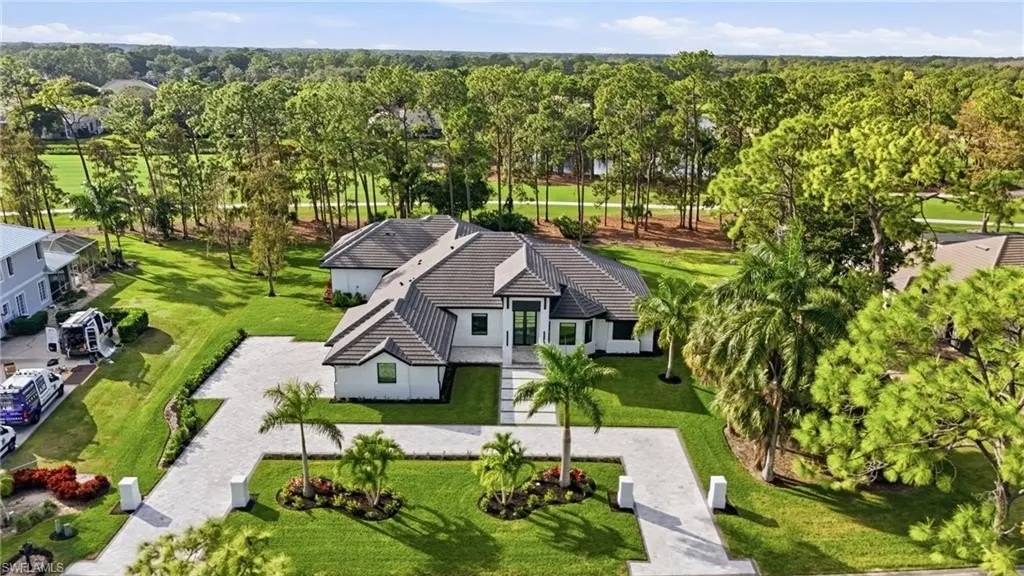 Pond Apple perfection. Completely reimagined in 2024-2025, this exceptional residence in Quail Creek Country Club offers a rare blend of architectural refinement, modern luxury, and thoughtful expansion, delivering the look and feel of new construction within one of Naples' most established golf communities. A 1,000+/- square-foot addition introduced a second luxurious primary suite, bringing the home to 4 bedrooms, 2 primary suites, a private office, 5 full baths, and a 3-car air-conditioned garage, totaling approximately 4,100 square feet under air. The home has been fully rebuilt from the inside out, including a redesigned front elevation with a striking modern luxury entry portico, instantly elevating curb appeal. Inside, soaring 14-16 foot ceilings, 10-foot Marvin impact windows and doors, floor-to-ceiling tile details, custom feature walls, and extensive downlighting define the clean, contemporary aesthetic. The chef's kitchen is a true showpiece, featuring Wolf and Sub-Zero appliances, a 6-burner Wolf gas range, custom cabinetry, exposed beams, and seamless flow into the main living and entertaining spaces. A custom wine wall and wet bar with Sub-Zero refrigerator further enhance the home's entertaining appeal. Every major system has been replaced or upgraded, including three new air conditioning systems, a new roof, spray foam insulation, new insulated garage doors, electric blinds throughout, and fully replaced and resized hurricane-impact windows and doors. Outdoor living has been completely redesigned, highlighted by a total pool renovation with an added sun shelf and elegant marble decking, creating a true resort-style setting. A covered lanai with outdoor kitchen, Storm Smart hurricane screens, and peaceful views of the 13th fairway with a fountain visible in the distance complete the outdoor experience. The property also features new irrigation, new sod, professional grading, and a bold modern square brick-paver driveway. This move-in-ready residence offers the rare opportunity to enjoy new construction quality, design, and systems in a premier golf community, combining timeless surroundings with today's most sought-after luxury finishes.