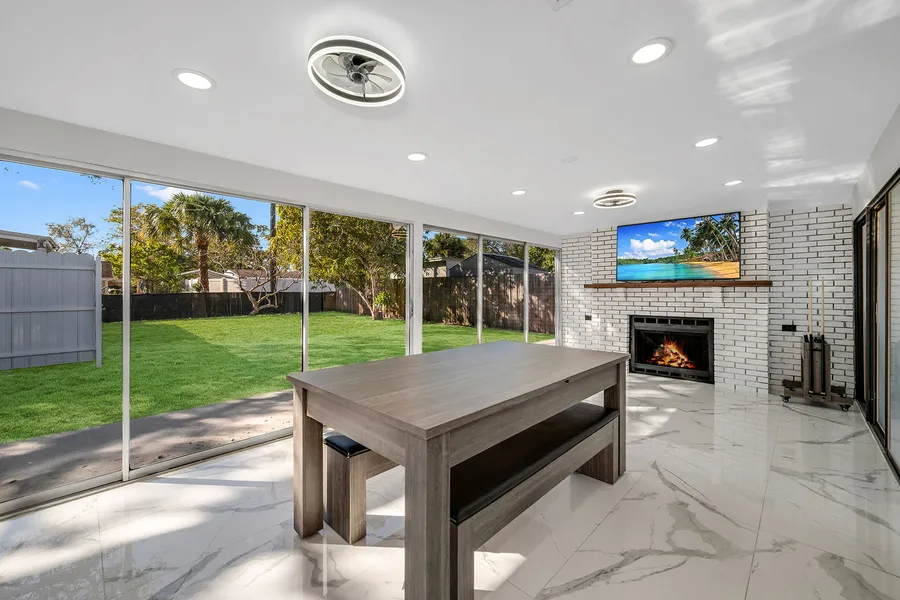 Located in Coconut Grove and bathed in desirable southern exposure, this beautifully furnished residence delivers a bright white interior, versatile living spaces, and a rare efficiency apartment all complemented by a private, fully fenced backyard ideal for relaxed Florida living. Thoughtfully designed to balance comfort and flexibility, the property includes covered carport parking in addition to guest parking, making it well suited for tenants or family and friends. A welcoming front patio sets the tone, while the interior unfolds into inviting living areas anchored by a fireplace that adds warmth and character. The main residence offers a well-planned three-bedroom, two-bath layout enhanced by crown molding, recessed lighting, ceiling fans, and tile flooring. The living room is designed for easy entertaining and comfortable day-to-day use, with thoughtful details throughout that elevate the overall experience. The kitchen is both stylish and functional, featuring crisp white shaker-style cabinetry, stainless steel appliances, a four-seater island, and clean finishes that complement the home's bright aesthetic. The kitchen flows effortlessly into a sun-filled sunroom, where abundant natural light pours in through glass sliders that open directly to the backyard, creating a seamless indoor-outdoor connection and a perfect setting for everyday living or casual gatherings. The primary bedroom enjoys tranquil backyard views and serves as a private retreat, complete with an ensuite bath showcasing a walk-in shower with a frameless glass enclosure and floor-to-ceiling tile. Two additional guest bedrooms provide comfortable accommodations, supported by a nearby bathroom finished to the same standard with a frameless glass walk-in shower and floor-to-ceiling tile. A well-appointed laundry room includes a full-size washer and dryer, upper cabinetry for storage, and a utility sink for added convenience. Additionally, a camera security system offers peace of mind. The efficiency apartment adds exceptional value and versatility, ideal for visitors, extended family, or flexible use, all while maintaining privacy within the fenced backyard setting. This is a unique opportunity to enjoy a furnished, move-in-ready home with multiple living options in a sought-after Naples location.