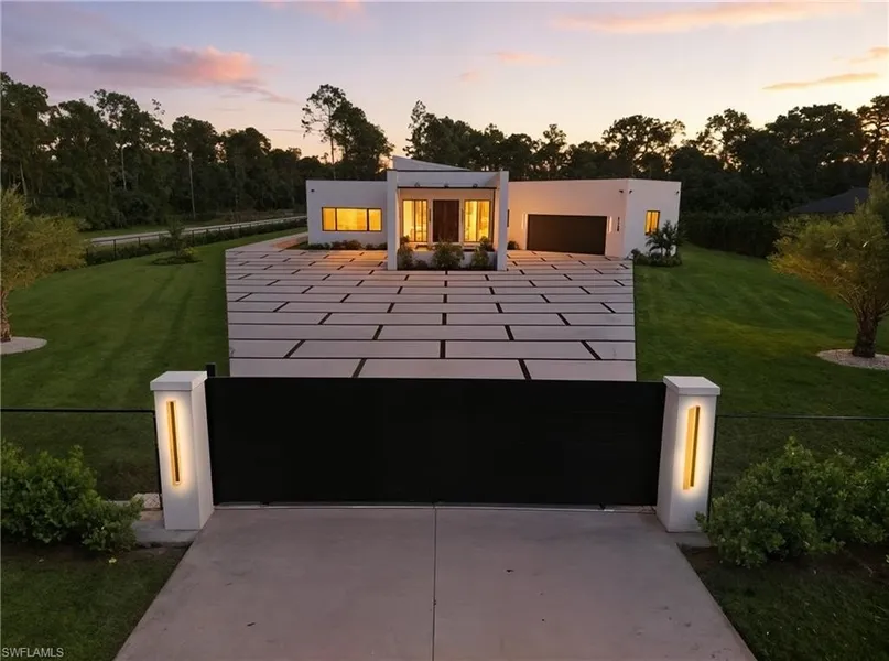 Discover this sensational modern estate in the highly desirable Golden Gate Estates community. Offering over 6,466 sq. ft. of living space on 2.81 private, fenced, and gated acres, this property is a serene retreat that perfectly blends luxury, design, and privacy. This custom-built masterpiece was crafted with exceptional attention to detail, featuring 4 spacious bedrooms, 4 full bathrooms, a chef inspired kitchen, and a striking glass enclosed wine cellar the perfect mix of sophistication and comfort. From the grand pivot wood door to the expansive impact windows that fill the home with natural light, every detail has been thoughtfully designed to connect indoor and outdoor living. The open-concept layout is ideal for both entertaining and everyday living. The primary suite offers a true spa like experience with a walk-in shower, dual vanities, a smart toilet, and custom wood cabinetry...
