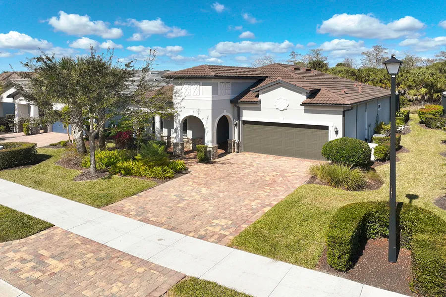 On a tranquil private preserve homesite in the sought-after community of Greyhawk, this beautifully constructed 2020 residence offers a blend of modern design, comfort and Florida lifestyle living. This two-bedroom plus den home features an open-concept floor plan with neutral tile flooring and an abundance of natural light streaming through expansive windows and dual sliding glass doors. The contemporary kitchen is a showpiece with crisp white cabinetry, elegant quartz countertops, a spacious center island and stainless steel appliances, including a gas range, ideal for everyday living and entertaining. The main living area seamlessly opens to a covered, screened-in lanai overlooking serene private preserve views. The exceptional outdoor space includes a natural gas heated pool, an expansive paver deck ideal for relaxing in the sun, and a custom awning creating a setting for alfresco di...