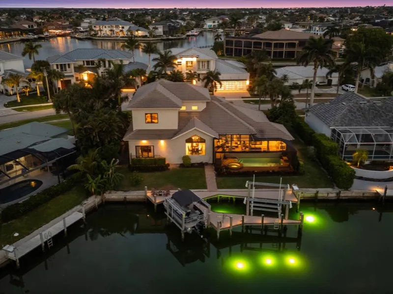 Magnificent waterfront home features 100' of waterfrontage, a short egress to the Gulf, and a complete renovation by Slocum and Christian - including a second story addition. With trademark style, you will be greeted by soaring ceilings, dramatic staircase, and ample natural light upon entering this stunning 4 bedroom plus spacious media room, 3 and a half bath, 3 car garage home. The main floor boasts a desirable open floor plan flowing out to the spacious lanai, ideal for entertaining indoors and out. The kitchen is sure to delight any chef with granite counters, large center island, KitchenAid stainless appliances, gas cooktop, custom cabinetry, and walk-in pantry. The formal dining room offers beautiful water views from numerous windows and the convenience of a custom wet bar. The master bedroom, located on the main floor, is a private retreat complete with stunning views and en-suite bath with walk-in shower, soaking tub, dual vanities, and walk-in closet. With another master suite on the main floor and two additional guest bedrooms on the second floor, there is plenty of space for friends and family. In addition to guest bedrooms, there is a massive additional room upstairs - create a home theater, bunk room, home gym, or office. The gorgeous lanai features beautiful wood ceiling details, pool, spa, and brand-new panoramic screens to enhance the views. Fisherman and boating enthusiasts alike will appreciate the large dock complete with 2 lifts and access to the Marco River within minutes of leaving your backyard. The 20,000lb lift will accommodate a 38' boat and the 10,000lb lift will accommodate a 25' boat. 5 new green underwater dock lights were recently added, enjoy watching sea life at night. The lush, tropical landscaping and zoysia grass lawn enhance the curb appeal of this exquisite home. The mature lemon, banana, and avocado trees allow you to pick fresh produce without ever leaving your yard. There has been no detail overlooked in this exceptional home.