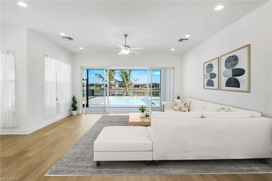 The light-filled, open-concept floor plan is designed for effortless living and entertaining. At the center of the home, the chef’s kitchen impresses with premium appliances, sleek quartz countertops, and a generous island perfect for casual dining or hosting friends. The spacious great room extends through expansive sliding glass doors to a covered lanai, revealing a private 30-foot lap pool with spa—an inviting space to unwind or stay active year-round.
