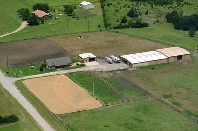 The combination barn and indoor round pen encompass about 9,000 square feet under roof. There are 14 stalls, all with swing out feeders, drop down doors, blanket bars and 2 outlets for fans and appliances. 12 stalls are 12x12 and 2 are 12x18 for foaling. The stall area has a vented roof and can get a nice summer breeze with its north/south placement. It is also well lit with skylights during the day and florescent lighting for evening. There is a concrete center aisle with cross-ties and folding saddle racks allowing you to tack up 6 horses at the same time, which is great for group lessons and riding with friends. There’s a wash rack with hot water, fly spray system, client tack room, owner tack room with cabinets, sink and refrigerator, feed room, and storage area for muck buckets and forks, etc. Behind the stalls is a large area for storing hay and shavings, so you never have to leave the barn in the rain to feed hay to your horses. In fact, the owners have stored up to 1,700 bales of hay and a semi-load of baled shavings in the barn, allowing the ability to place larger orders to get better pricing and quality. For ease of turn-out, the round pen has gates to the barn and the 2 largest pastures, allowing you to simply close the front barn doors, open the stalls for the horses in that pasture and let them walk in or out on their own.