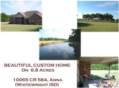 Nearly new custom home on 6.8 acres located just off of Hwy 121. Beautiful setting on a quiet paved country road. Home features granite counters, stainless appliances, tile floors, custom trim, large rooms, and a huge covered patio. Also features a small pond, lots of extra driveways for equipment and cars. This home is in immaculate condition with beautiful decorator colors and decor.