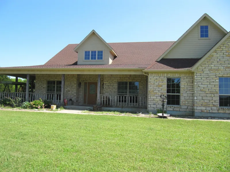 Beautiful Texas Ranch! Secluded acreage with trees and pastures. Native pecan trees scattered throughout property. Stone ranch home boast of rich hickory trim accents large bedrooms and multiple living areas. 3 metal barns, one is a chicken coop. Part of property high cross fenced into lots. Perfect for raising exotics, deer, horses or other animals or a rescue facility. Stocked pond on property. A true slice of Texas for your family or business.