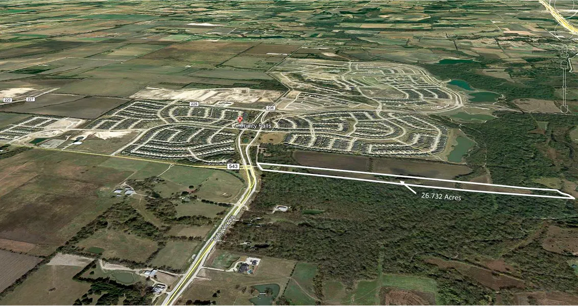 26+ acres adjacent to Trinity Falls Housing Development. Property extends from Trinity Falls Parkway east to the East Fork of the Trinity River. Some flood. Beautiful land with many possibilities. House on property to be sold as is. Septic, co-op water, electric are currently in use. Well on property, but not in use. Property has access to city sewer, which crosses eastern section of property.