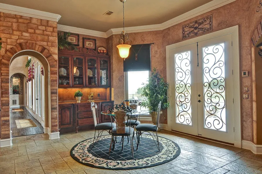 Artist drawn murals throughout this amazing home. Top of the line casement windows, lighted barrel foyer ceiling, hand scraped hardwoods with floor to ceiling windows. Family room has open floor plan with stone fire place.