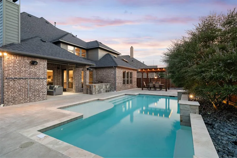 Light Farms living with your very own pool & backyard oasis.Situated on a corner lot, upgrades include a stone elevation, hardwood flooring, designer tile & a floor to ceiling stone fireplace. The spacious kitchen with cabinet lighting, pot filler, & granite counters is perfect for entertaining. The master retreat is privately located with a beautiful ensuite bathroom. Custom closet shelving in master & pantry. The upstairs boasts a large game & media room. The spacious attic is decked completely & pre plumbed for a half bath. Step out back to your beautiful heated saltwater pool, outdoor fireplace, kitchen & arbor. The oversized 3 car garage can fit your largest vehicle. Prosper ISD & parks, pools & lakes.