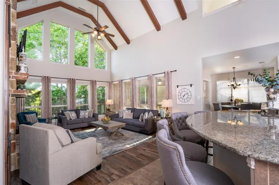Beautiful Custom built in 2011. 3,618sf of recently updated bright and beautiful 4BR 3.1Bath 2-Car Home. Great drive-up with mature trees and inviting front porch. Enter foyer to formal dining and dedicated office as art niches as wood flooring guides you to large Open kitchen & Family room w Two-story ceiling wBeams. Oversized granite island seats 5 w custom alder cabinetry and gas cooktop. Stone fireplace from floor to ceiling lined w custom built-ins. Stunning views of the greenbelt. Lg bright Breakfast area w Access to enclosed covered breezeway-sunroom. Backyard large enough to build a pool wPergola hosting a fire pit. Master BR down wUpdated Master Bath wGarden Tub and Oversized shower wSeat. Huge Master Closet. Upstairs are 3 large bedrooms, with two full baths. Game room open to downstairs. Separate media room with all the feel of a theater. This house has it all! Many updates in...