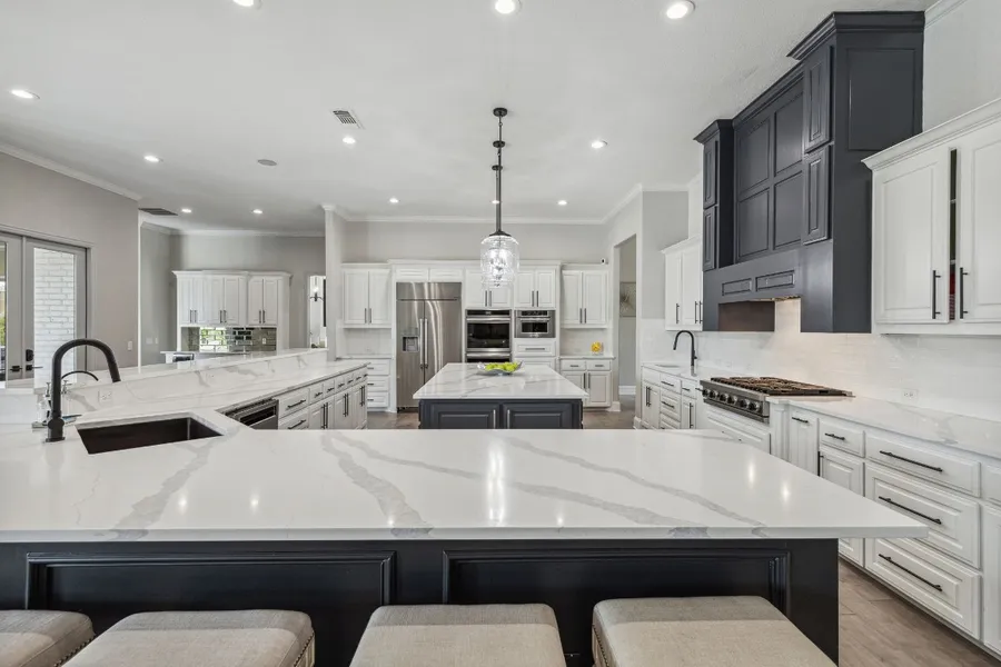 Dave Williams home situated on a private cul-de-sac lot in sought after Whispering Farms! Great backyard designed for entertaining w-multiple open & covered patios, outdoor kitchen, motorized sun shades, turf, fireplace, sparkling heated pool w-spa, sound system, fire pit and dog run! Tall ceilings, designer lighting, neutral colors, huge gourmet chef's kitchen w-wrap around breakfast bar, large island, gas cooktop, dual ovens + built in fridge, dual wine fridges, tons of storage and whole home water softening system! Gorgeous elevation w-brick & stone, front covered porch + 4 car garage! Thick crown molding, plantation shutters, living area w-floor to ceiling stacked stone FP flanked by custom built-ins! Single story, 4 Bedrooms and 4 full & 2 half baths. Elegant primary bath with professionally designed closet. All new energy efficient insulation & HVAC added 2022. Huge office with bui...