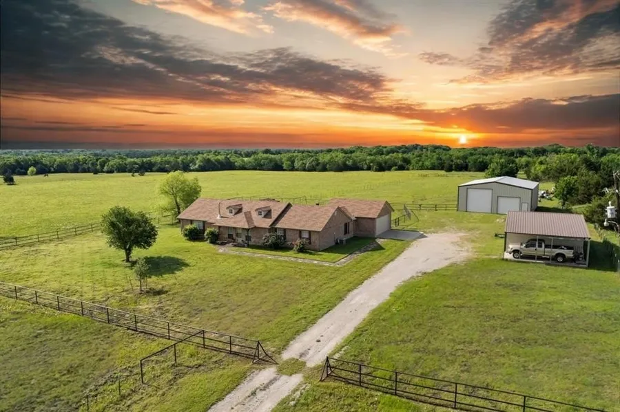 Enjoy a $10,000 seller concession that you can apply toward reducing your interest rate, covering closing costs, upgrading your new home, or using however you see fit. This 32-acre Texas ranch is the perfect blend of function and tranquility, offering everything you need for raising animals, storing equipment, or running a business from home. With an AG exemption already in place for 22-acres, the land is fully cross-fenced with no-climb fencing, featuring side and rear gates for easy access and livestock separation. Two spacious metal workshops provide endless possibilities. The 40x50 shop is fully insulated with spray foam and includes two 14ft automatic pull-through doors, making it ideal for storing an RV, large trailers, or heavy equipment. The 20x30 shop features a roll-up door and two overhang carports, perfect for additional storage or workspace. Whether you need room for tractors, feed, or a place to work on projects, these shops deliver both convenience and efficiency. At the heart of the property is a custom-built ranch home with a split floor plan offering 3 bedrooms, 2 bathrooms, and an oversized game room. The open-concept living area flows into a kitchen with stainless steel appliances, ample counter space, and stunning views from every window. The primary suite is a true retreat, featuring a walk-in closet, garden tub, dual sinks, and separate shower. With stained concrete floors and custom molding, the home combines rustic charm with modern convenience. Step outside to a large covered patio with a swing, where you can sip your morning coffee and overlook your land. You'll enjoy the electric front gate to the property, 150amp house plug, high impact roof replaced in 2017, and interior paint in 2024. Located just one hour from the DFW metroplex, this property is ideal for livestock owners, show competitors, or anyone needing ample workshop space. With easy access to TX, OK, AR, and LA livestock events, this ranch is a rare find.