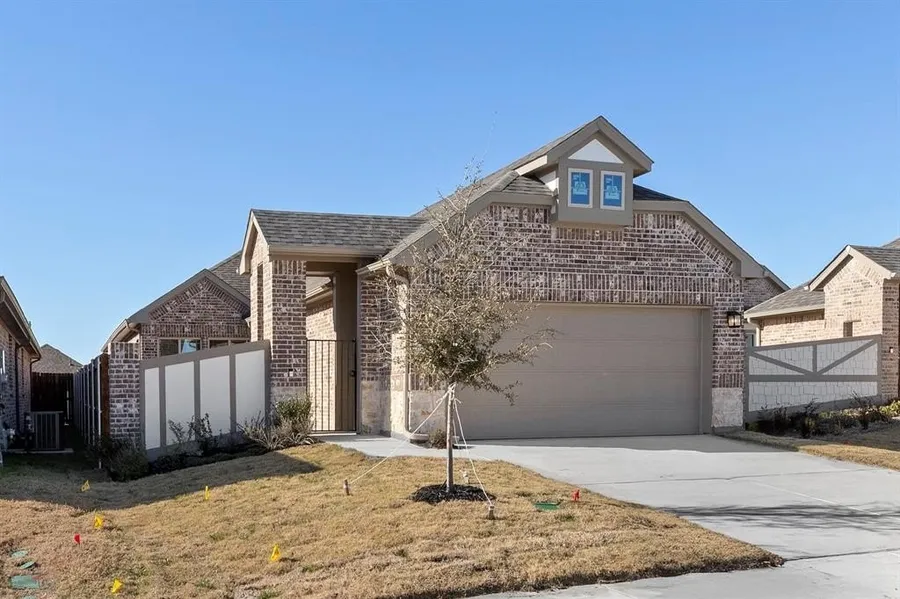 MLS# 20971819 - Built by Pacesetter Homes - Ready Now! ~ This single-story courtyard-style home blends open living with thoughtful upgrades throughout. Featuring 3 bedrooms and 2 bathrooms, it offers a spacious layout with a large family room centered around a cozy fireplace and plenty of natural light. The kitchen includes an extended cabinet layout with a central island, maple-stained cabinetry, quartz countertops, a 5x5 white tile backsplash, smart storage solutions like pot and pan drawers and a pull-out trash can, and GE stainless steel appliances complete the space. Luxury vinyl plank flooring runs through the main living areas, while added disk lighting in the family room and primary bedroom enhances the home's bright, inviting feel. The primary suite includes a glass-enclosed tile shower with a sleek shower set for a spa-like touch. This low-maintenance courtyard layout offers comfortable living with upscale features and a relaxed flow from room to room. Located in the highly sought-after Elevon community, this home is just around the corner from the upcoming Amenity Center, which will include a pool with tanning ledge, splash pad, private cabanas, outdoor kitchen, clubhouse, playgrounds, and sports courts including pickleball! Plus, enjoy miles of nature trails and the convenience of 1-gig fiber optic internet included in the HOA. Your Pacesetter Home comes equipped with a suite of smart features designed to enhance everyday living.-Ring Video Doorbell-Brilliant Smart Home System to control lighting and music-Honeywell Smart T-stat.