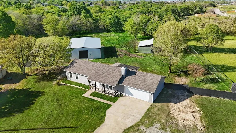 This adorable farmhouse sits on OVER 2 ACRES! Nestled in the quiet subdivision of Settlers Creek with two outbuildings and plenty of space to roam, the possibilities are endless for this unique property. The open living space boasts vaulted ceilings with wooden beams, wainscoting, porcelain tile flooring, anchored by a beautiful wood burning rock fireplace and flows seamlessly into the kitchen and dining area. The kitchen features freshly painted cabinets with updated hardware, a breakfast bar, and overlooks the spacious backyard. You will find timeless hardwood flooring in the hall and both bedrooms. The attached garage is oversized and has an insulated door. The 40x60 workshop is ready to store anything you need.. equipment, ATVs, or a boat.. your just 5 miles from the Lake Lavon boat ramp! The second outbuilding is perfect for your animals. Enjoy cool evenings on the large covered back porch. No HOA! Don't miss this one! It is what you have been waiting for!
