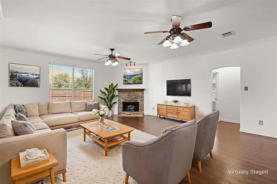 PROFESSIONAL PAINTING JUST COMPLETED THROUGHOUT ENTIRE MAIN FLOOR!! Discover unparalleled comfort and convenience in this meticulously designed 3,025 square foot home, gracefully situated on a generous .280-acre lot on a quiet cul-de-sac street. The community features a picturesque 10-acre lake with a private fishing dock - a true hidden gem in your own backyard! The heart of this home is a chef's dream kitchen, featuring gorgeous cabinetry, gleaming granite countertops, and stainless steel appliances. Enjoy casual meals in the sun-drenched breakfast nook, offering charming views of the backyard. The oversized formal dining room provides incredible flexibility, perfect for elegant dinners, a spacious home office, or a vibrant play area. Gather around the impressive stacked stone fireplace, the stunning focal point of the expansive living room, ideal for cozy evenings. Indulge in your private oasis within the spa-like primary bath, boasting an invigorating 24-inch rainfall shower head, soothing massage jets, and a luxurious Kohler jetted tub - pure relaxation! Upstairs, a versatile suite with an en-suite bath offers endless possibilities as a second primary bedroom, a dynamic game room, or a dedicated playroom, complete with a walk-out balcony. Perfect for multi-generational living. Outdoor living is a breeze with an oversized double gate providing convenient boat or trailer storage, a comfortable covered patio for al fresco dining, and a handy storage shed. The extended driveway generously accommodates up to six cars! Enjoy the peace of mind that comes with a LOW TAX RATE, NO MUD, and NO PID. Plus, benefit from the convenience of walking to the highly-rated O'Dell Elementary as well as all the wonderful community amenities.