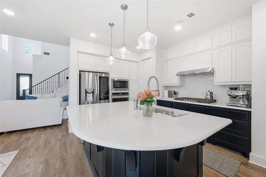 The chef-inspired kitchen serves as the heart of the home, featuring quartz countertops, stainless steel appliances, a large center island, and ample cabinetry, flowing seamlessly into the living and dining areas—perfect for entertaining or everyday living.
