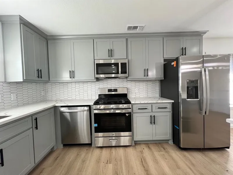 Beautiful brick home with 3 bedrooms and 2 full baths. This beauty has been completely remodeled with modern light fixtures throughout, black door handles and plumbing throughout. Open floor plan with tiled fireplace, spacious kitchen with new custom cabinets, Quartz countertops, white modern backsplash and newer SS appliances. Luxury vinyl throughout the home, NO carpet. Master bedroom has new modern fans and master bathroom has double vanity with black & gold touches and two large WICs. Two secondary bedrooms and hall bath have similar modern updates. Brand new HVAC, fence and appliances. Conveniently located near highways, shopping & dining and a short drive to Downtown McKinney. Come See today!