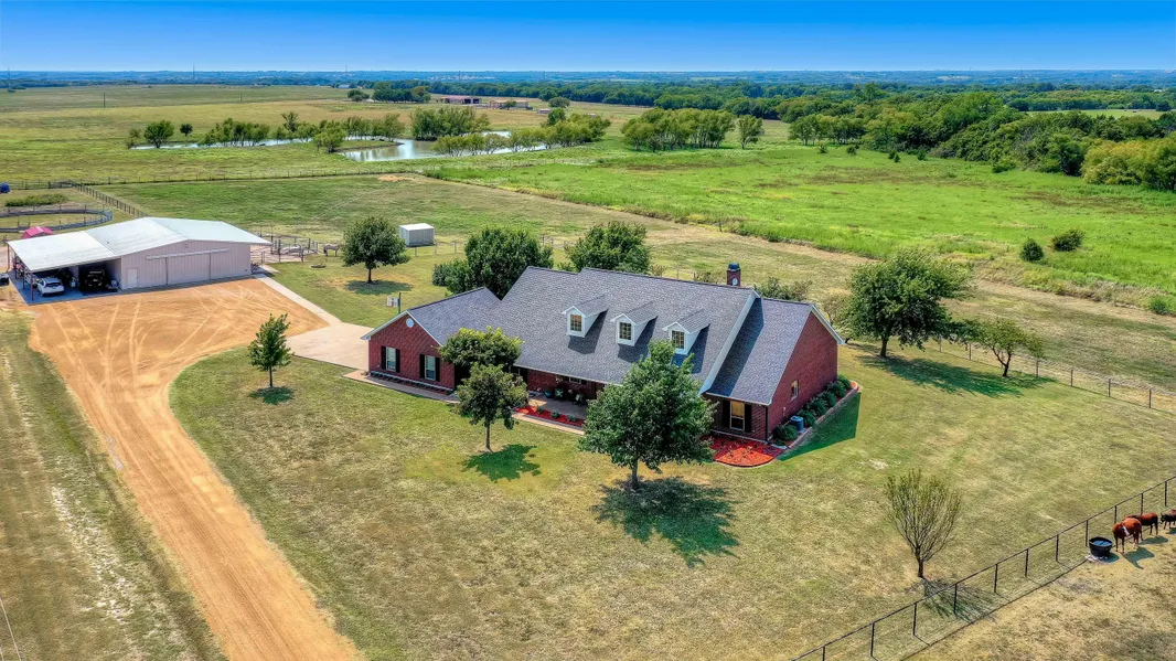 Spacious open floor plan home with split bedrooms, beautiful wood floors. Wonderful master with large bath, walk in shower and large closet. Great Room combining living & dining areas, oversized utility room, oversized attached 2-car garage. Covered front and back porches provide morning and evening relaxing space. Barn has4 stalls and office with full bath. Additional covered area on side with wash rack and hay storage. Fenced and cross fenced with pipe and cable fencing. Storm Shelter outside of Barn office area.
